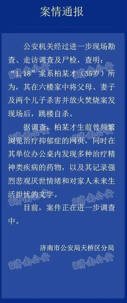 济南市公安机关经过进一步现场勘查、走访调查及尸检,查明:“1.18”案系柏某才所为,其在六楼家中将父母、妻子及两个儿子杀害并放火焚烧案发现场后,跳楼自杀。
